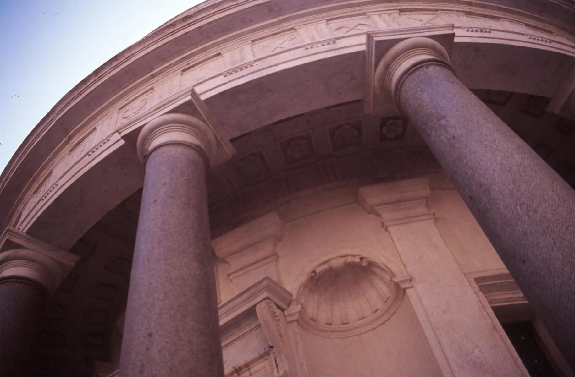 ……………..The Tempietto 's fame is due to the fact that its external shape appears to be made from a single piece, which is why its contemporaries considered it an example of the perfect approximation of antiquity. This harmony is not achieved, however, by imitating a particular building type, but through the coherent reorganization of ancient architectural elements and proportions. Although the Tempietto does not deny its origins in the Roman round temple (tholos), it is a structure sui generis…………