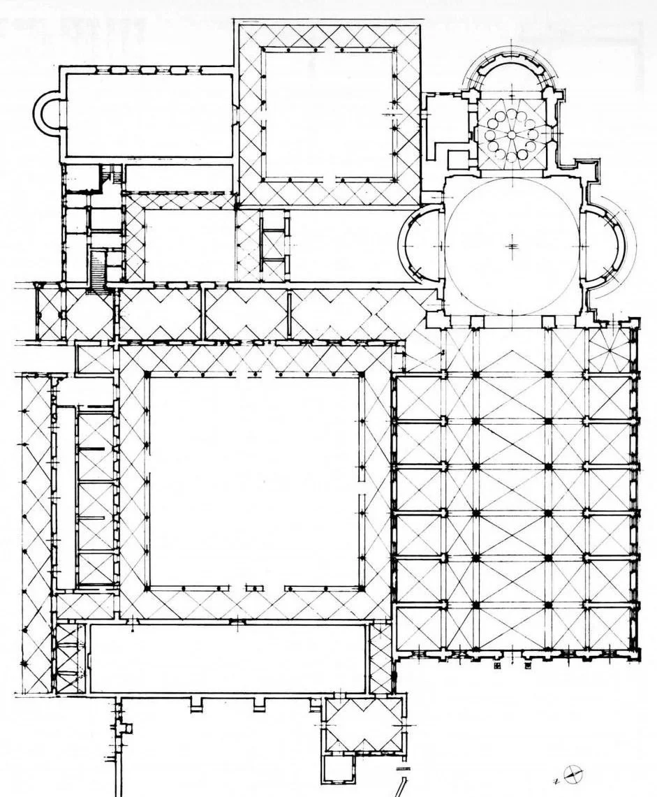 ……...Cardinal Oliviero Carafa commissioned Bramante to design the cloister of Santa Maria della Pace in Rome in 1500. This was his first important commission in Rome……With the courtyard of the monastery of S. Maria della Pace, Bramante created a new prototype for the design of the two-storey loggia courtyard. Its proportions are considered canonical, as the total area is divided into 16 units so that each side has 16 square bays, a number that Vitruvius sees as the most perfect number . The pillar arcades on the ground floor do not have half-column templates as in the Palazzo Venezia, but rather slender pilaster templates of the Ionic order on high pedestals. They correspond to compressed pillars of composite order on the lower upper floor, which can also be understood as bundles of square columns. They alternate with Corinthian columns, which stand on the smooth balustrade exactly above the arch apex of the ground floor. The corner conflict that is typical of arcade courtyards with a blind order could be solved thanks to this structuring system: the pilasters of the ground floor are reduced in the corners to a narrow square bar, which is provided with a residual capital on which the entablature rests. The corner pillar, which is set and provided with pillar templates on both fronts, enables a transition between the courtyard wings, which meet at right angles, in accordance with the canon of order on both the ground and upper floors……..